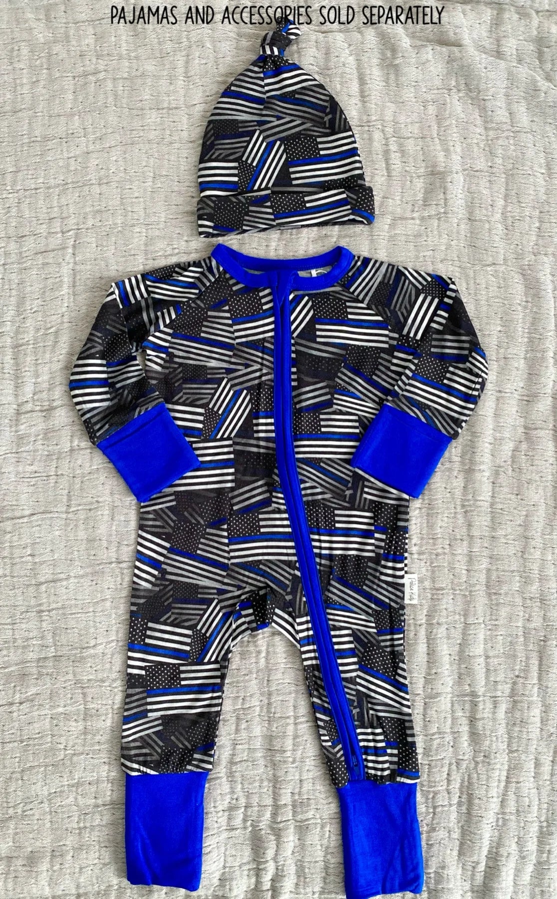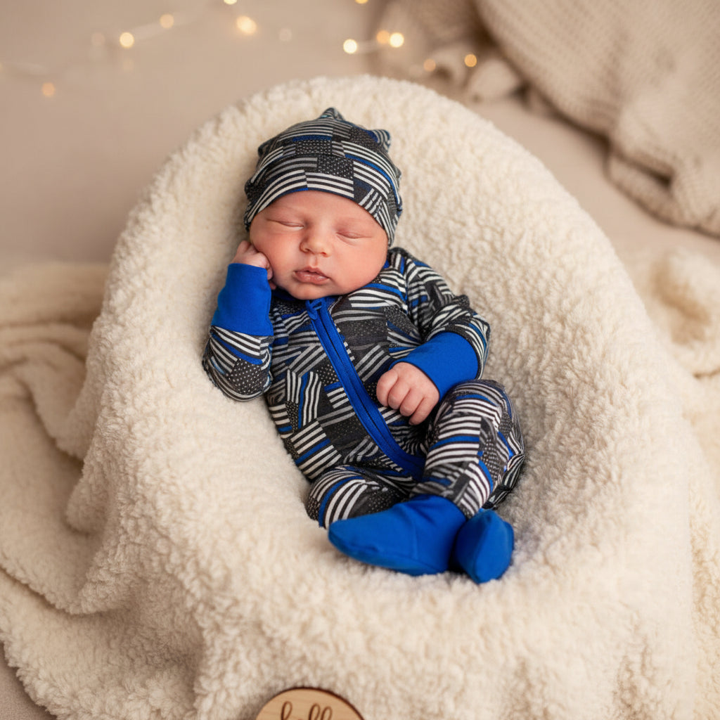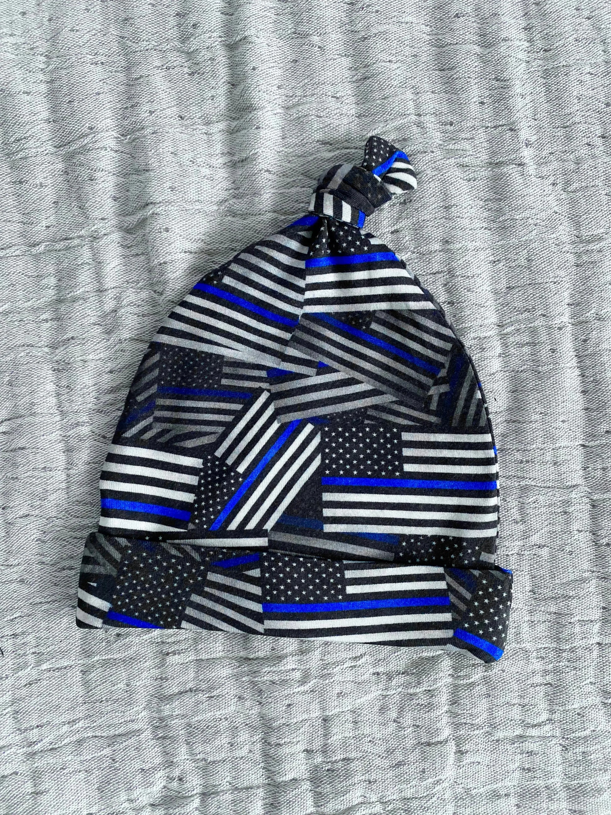 Unique Law Enforcement pattern knotted hat - A newborn must have! Our bamboo viscose knotted hats match perfectly with our Comfy Cozies, making this the perfect combo! Adjustable knot for the perfect fit. Fits approximately 0-3 months.