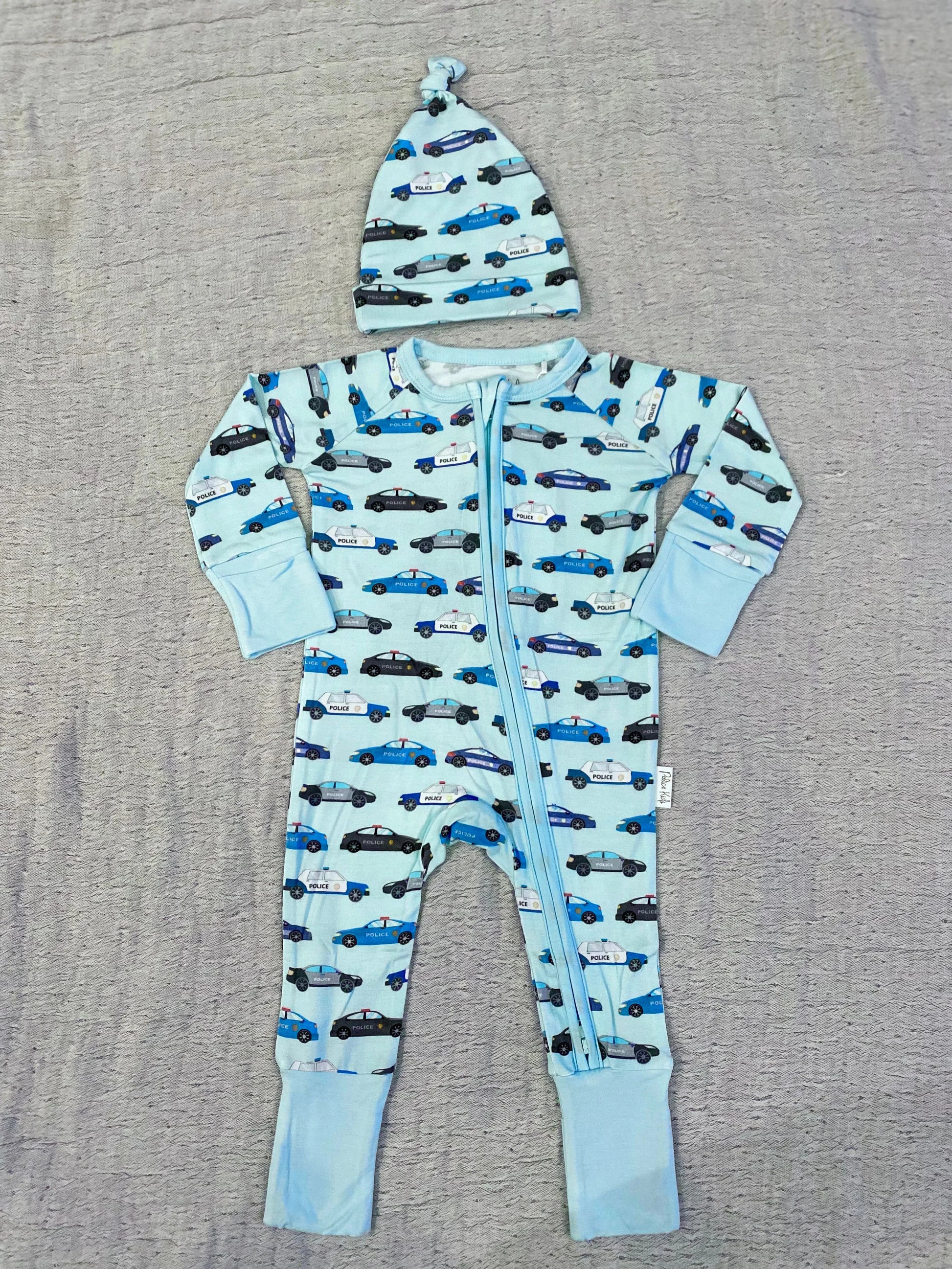 Unique Law Enforcement pattern knotted hat - A newborn must have! Our bamboo viscose knotted hats match perfectly with our Comfy Cozies, making this the perfect combo! Adjustable knot for the perfect fit. Fits approximately 0-3 months.