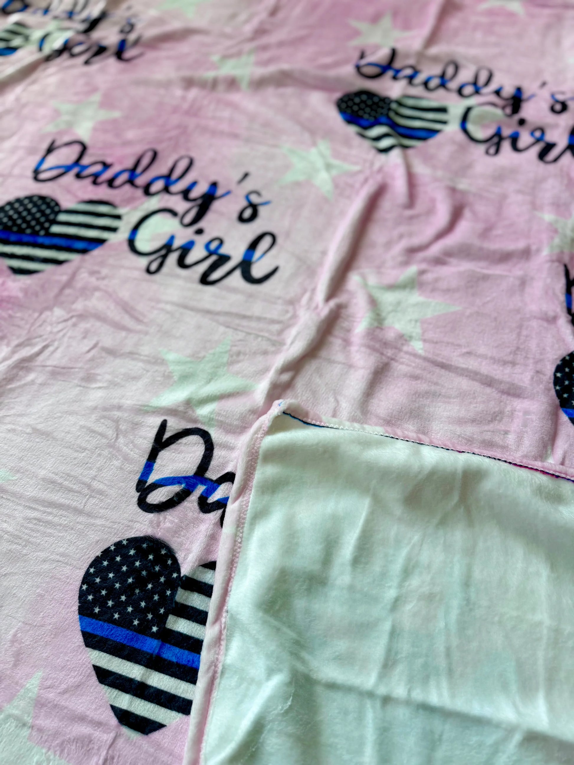 Our large 60x60” fleece cuddle blanket in “Daddy's Girl" pattern is perfect for couch cuddles, a stroller blanket, nap time, and more. Makes for a great throw blanket or a great background for photoshoots too!