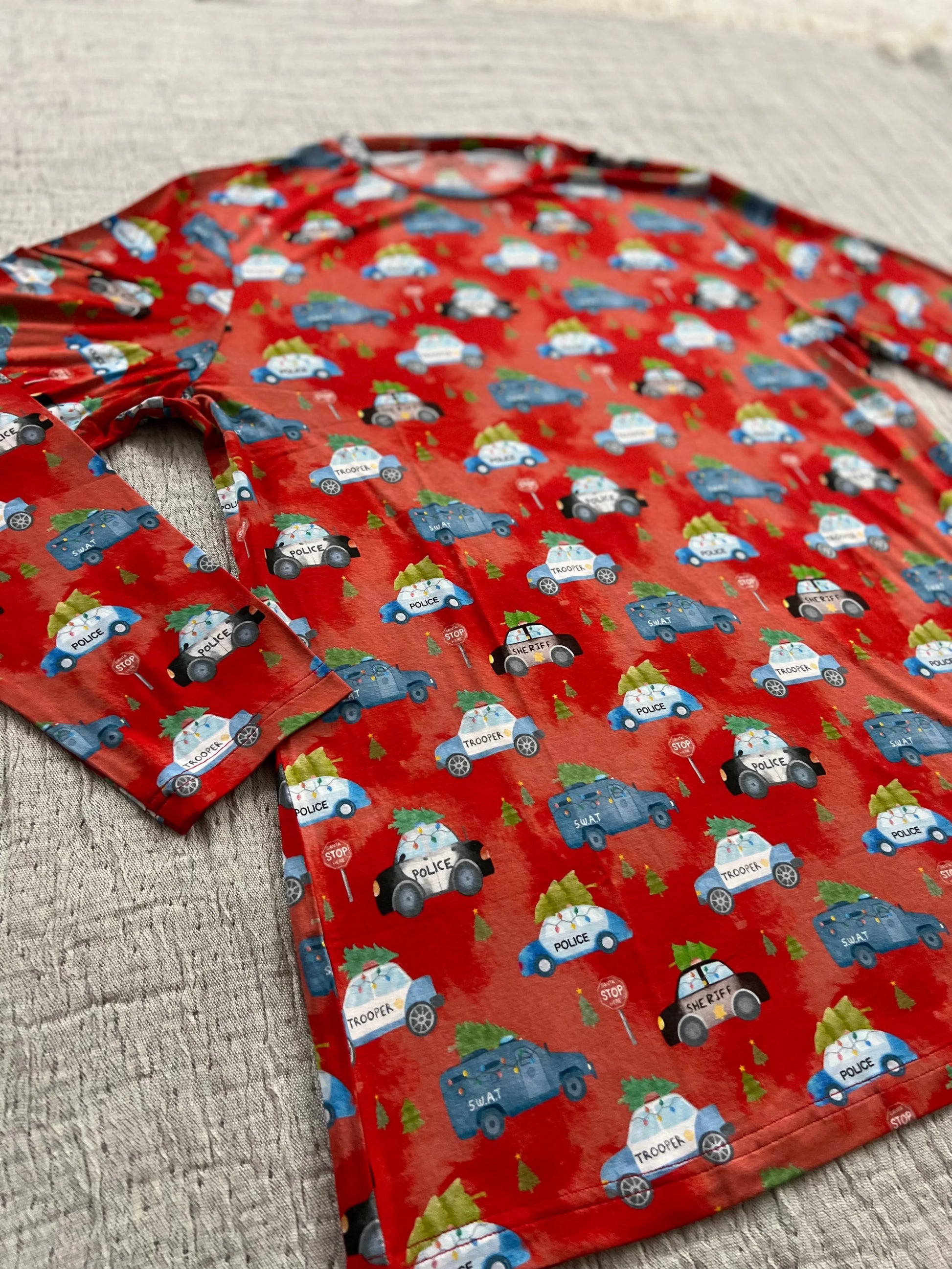 Look closely to see Police, Sheriff, Trooper, and SWAT vehicles decked out in holiday lights and topped with Christmas trees ready for delivery. These cruisers will be sure to enforce traffic as they patrol the tree farm with mini stop signs reading “Santa Stop Here" Watercolor red background makes this the perfect holiday print!