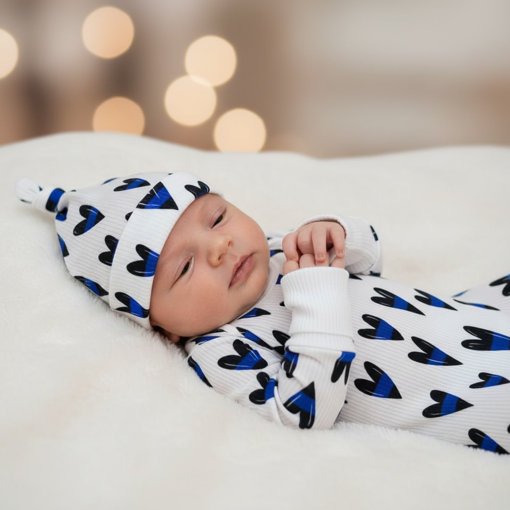 Unique Law Enforcement pattern knotted hat - A newborn must have! Our bamboo viscose knotted hats match perfectly with our Comfy Cozies, making this the perfect combo! Adjustable knot for the perfect fit. Fits approximately 0-3 months.