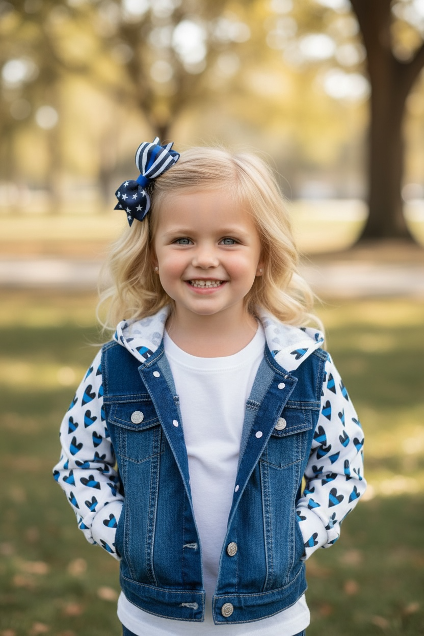 The perfect jacket to add to your child’s everyday wardrobe! Our Blue Line Hearts denim jacket is a must-have layering piece for little heroes! Designed to pair effortlessly with tees, dresses, or cozy bamboo sets, this jacket adds the perfect touch of personality to any outfit.