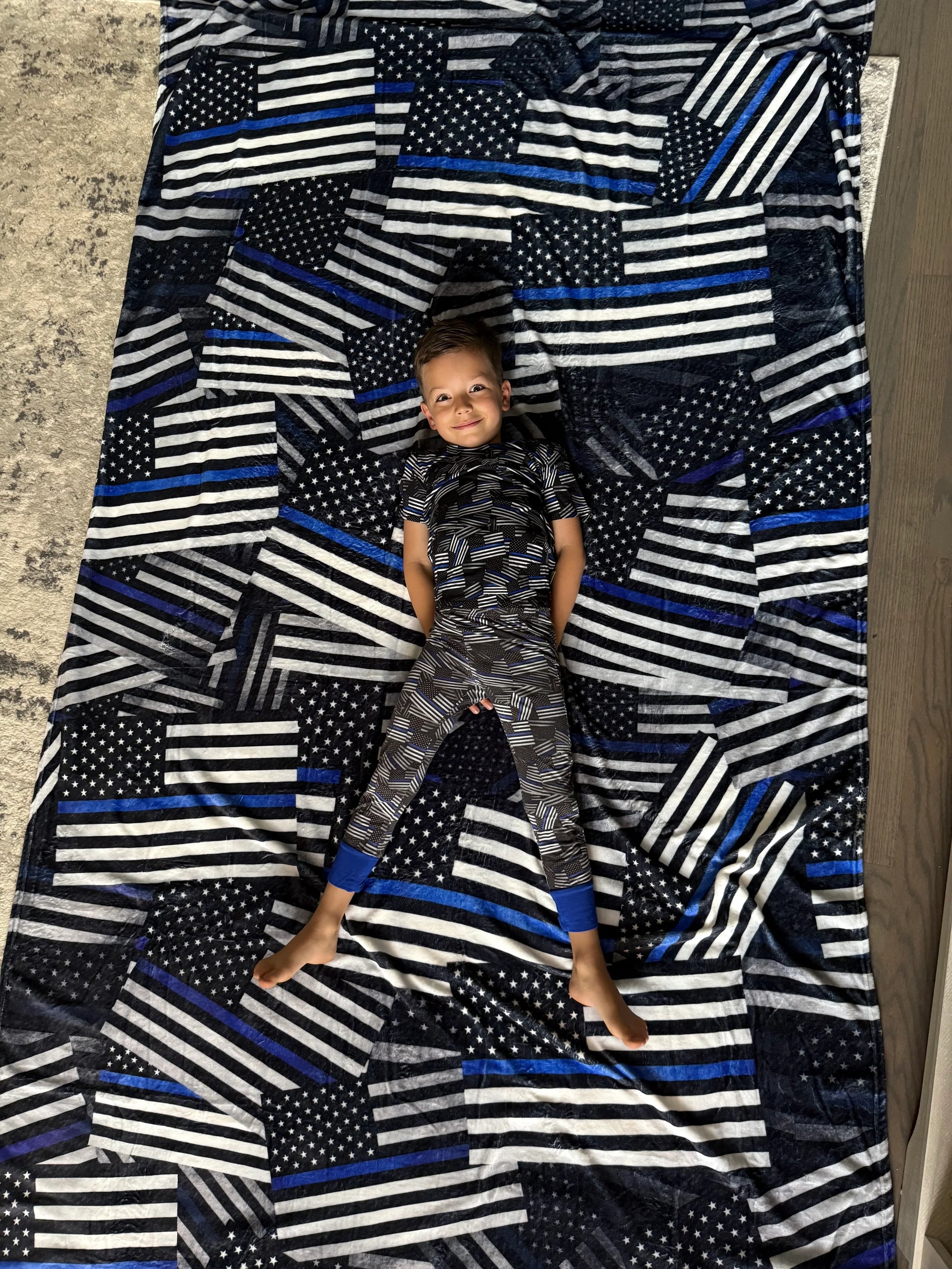 Wrap yourself and the entire family with this Oversized Family Couch Cuddle Blanket!! Measuring extra large at 60 by 120 inches, this ultra-soft blanket is perfect for everyone on the couch to share! This blanket features the Thin Blue Line Flags pattern and is made with ultra soft fleece. Perfect for movie nights, couch cuddles, or simply showing your support to Law Enforcement. It’s more than big enough for the whole family to snuggle under!