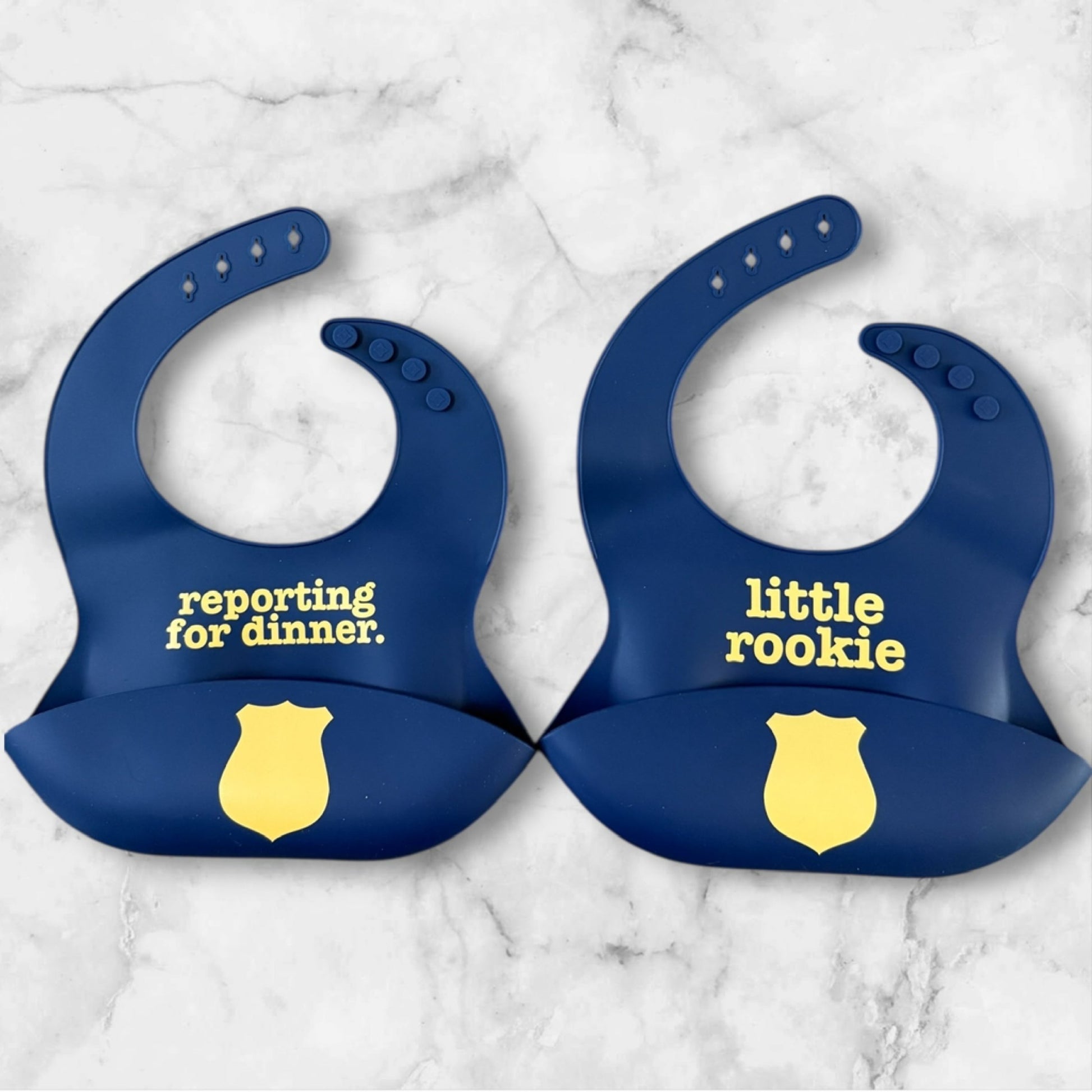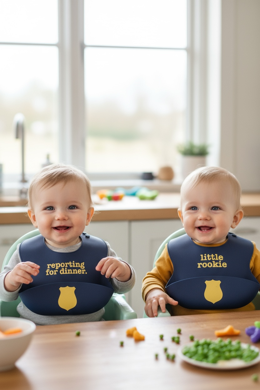 Make mealtime fun for your little hero with our Silicone Catch-All Bibs, designed exclusively for little heroes. Choose from two adorable styles—“Reporting for Dinner” or “Little Rookie”—or grab the discounted two-pack bundle to get both!