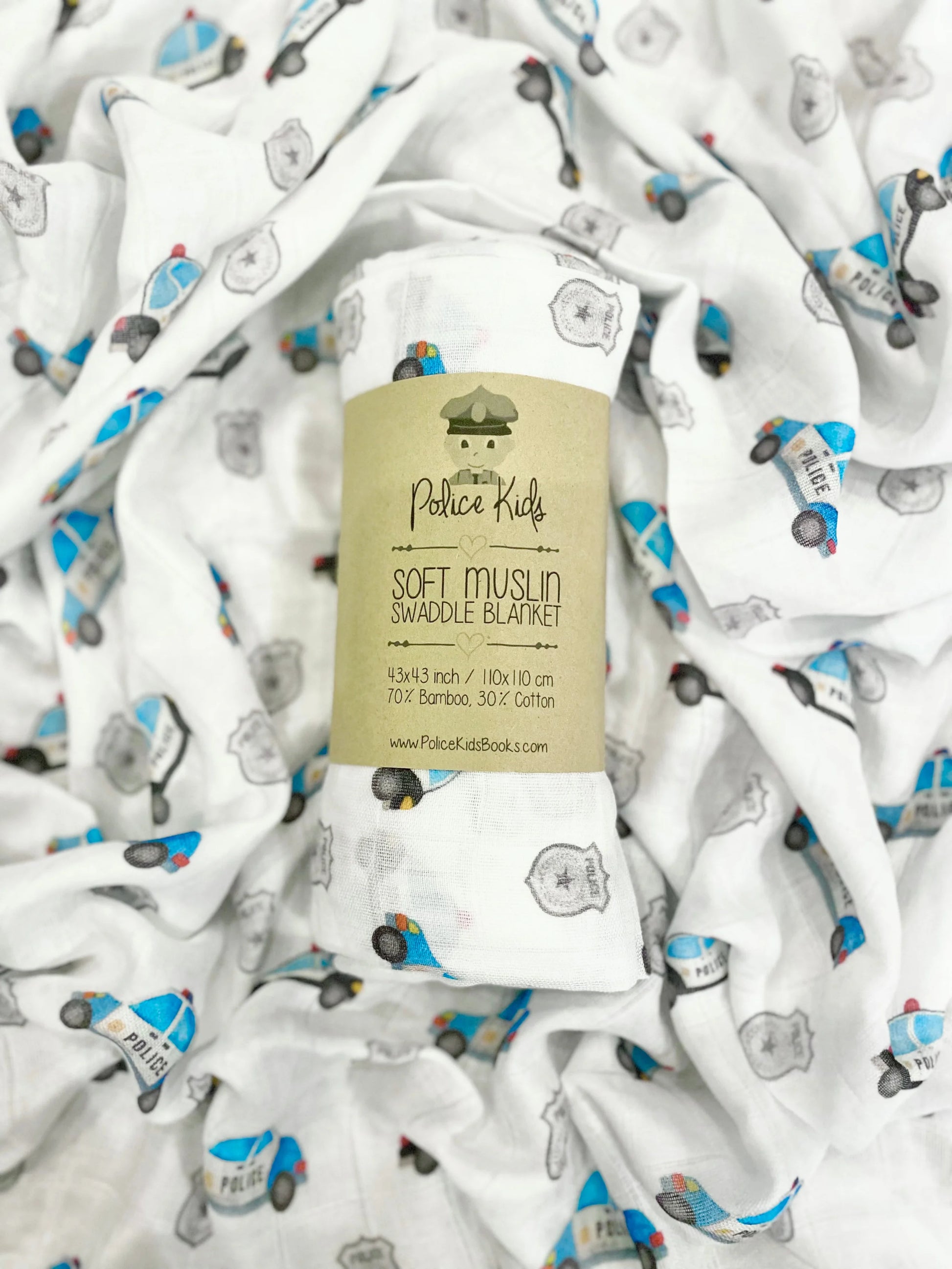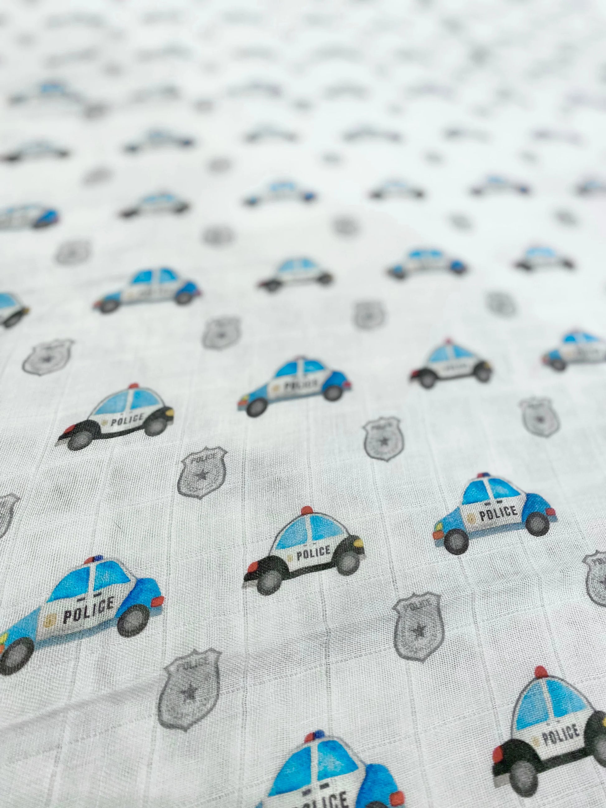 This custom designed Police Cars and Badges Bamboo Cotton Muslin Swaddle Blanket is a must have for Law Enforcement families with little ones! Soft and breathable, this is the perfect blanket that can be used in so many ways. Use with newborns as a swaddle blanket, receiving blanket, stroller/car seat cover, nursing cover, play mat, or even as a beautiful prop to use in newborn photo shoots or monthly milestone photos. Great for everyday use due to its versatility. Makes the perfect gift for baby showers too! The possibilities are endless with this super cute, Police themed Muslin swaddle blanket.