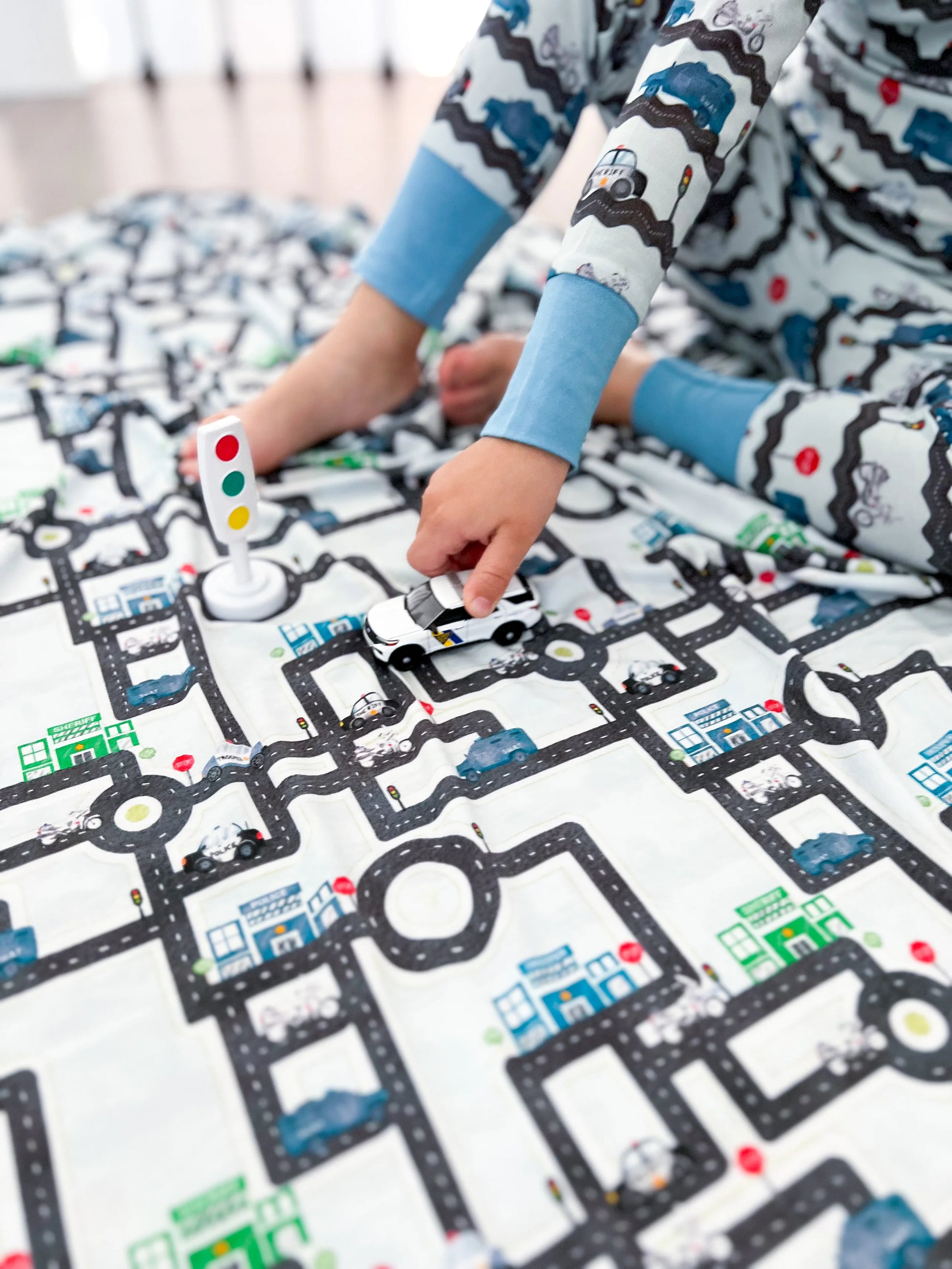 This pattern features the "Road Patrol” pattern on one side, and a fun road map with police stations and the road patrol vehicles incorporated. Perfect as a blanket or a playmat! This double sided design allows for versatility with bedding and to have two options to choose from, all on the same blanket!