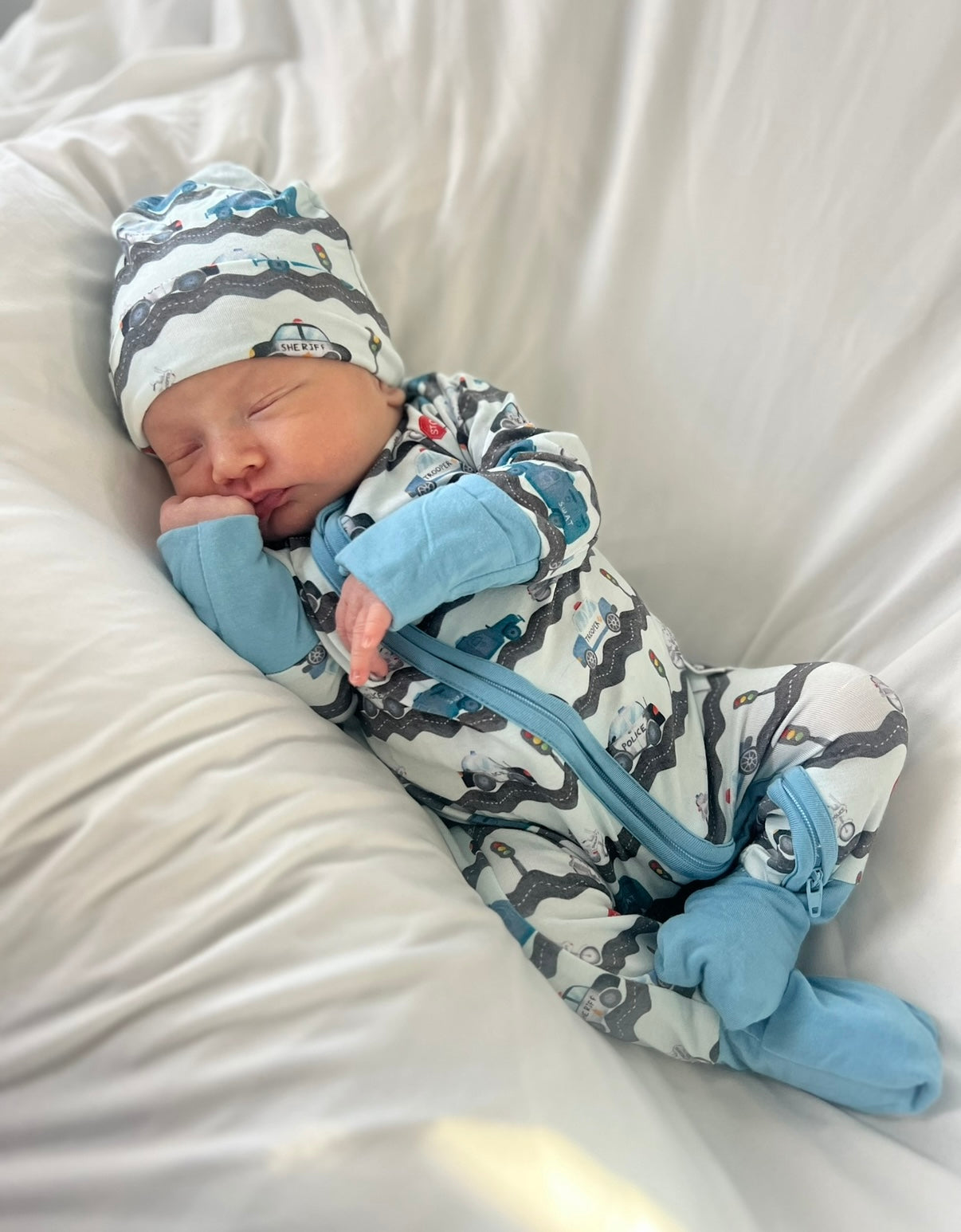 Unique Law Enforcement pattern knotted hat - A newborn must have! Our bamboo viscose knotted hats match perfectly with our Comfy Cozies, making this the perfect combo! Adjustable knot for the perfect fit. Fits approximately 0-3 months.