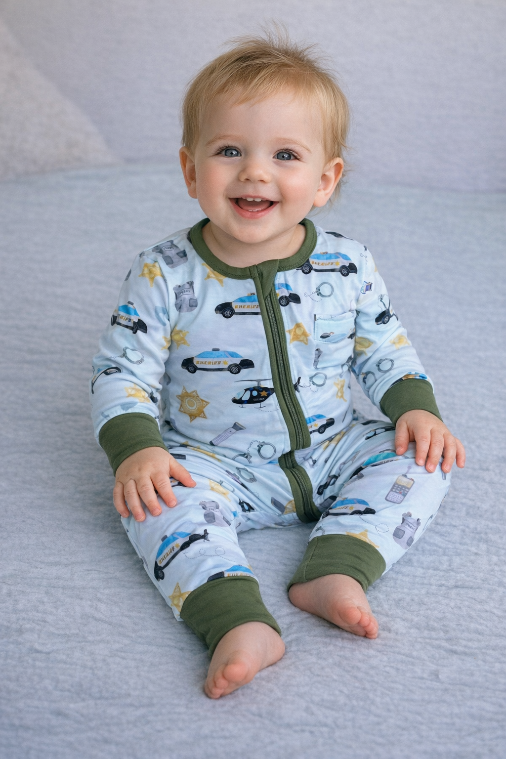 Super soft, comfortable, and adorable! Our unique one of a kind Law Enforcement “Comfy Cozies” Zip-Up will be your child’s favorite pajamas! 95% Bamboo viscose and 5% spandex that is extra soft for comfort and sensitive on skin. Featuring fold-over foot cuffs and mittens, and a double zipper for easy changing! No buttons, snaps, or interior tags!