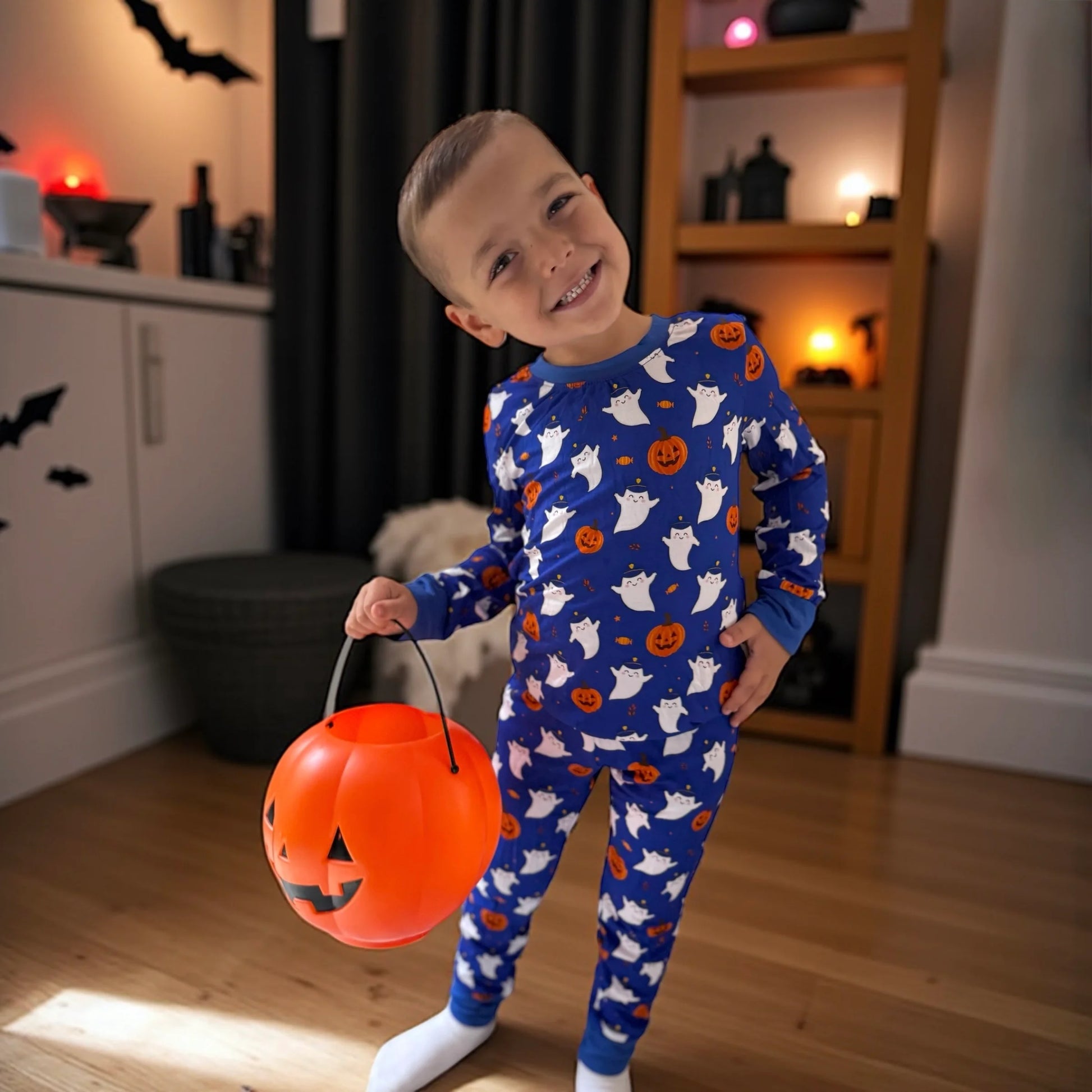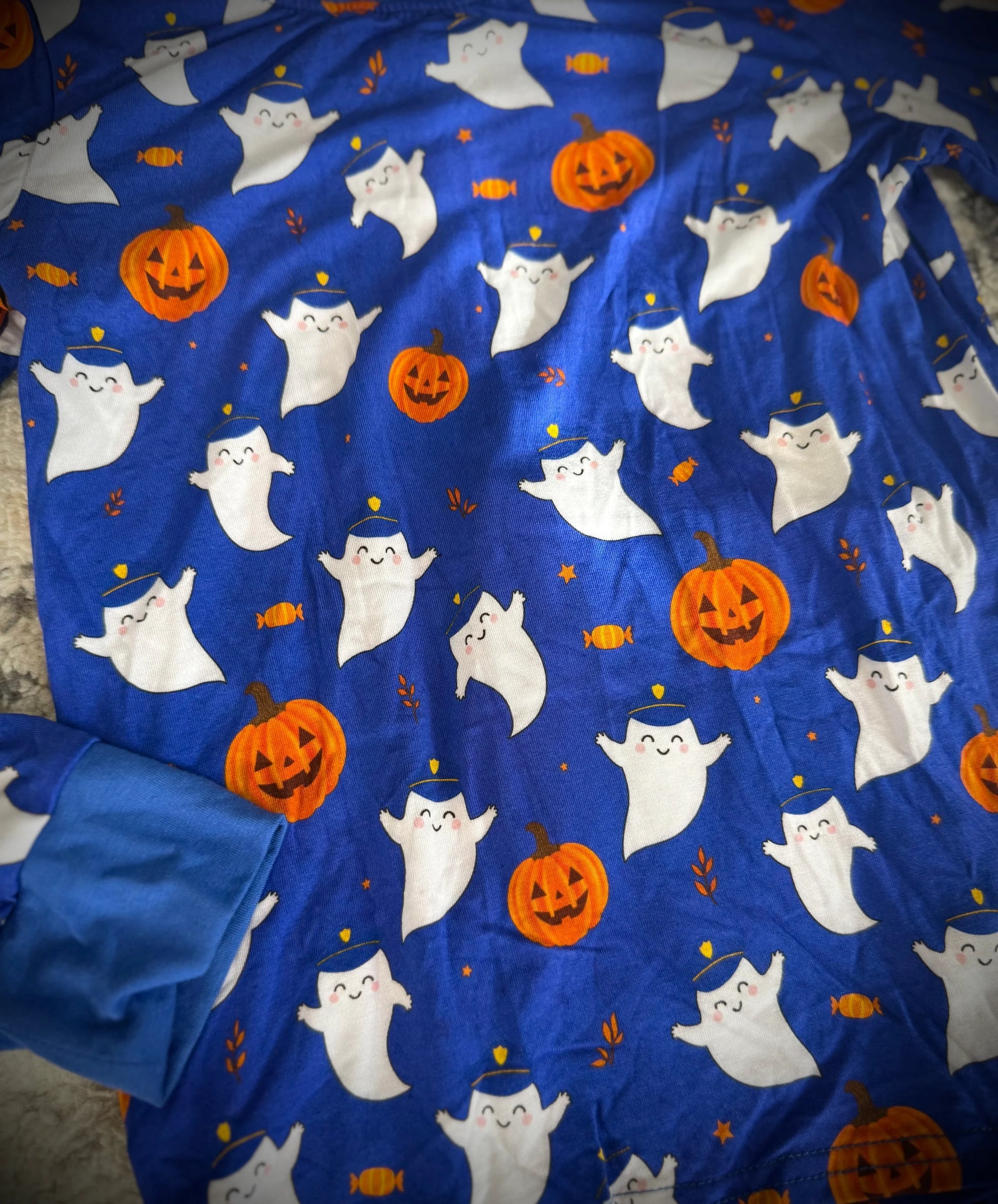 "Back the Boo" is an adorable Halloween-themed print featuring friendly Police ghosts, pumpkins, candies, and fall elements! Paired with a vibrant blue background and blue cuffs!